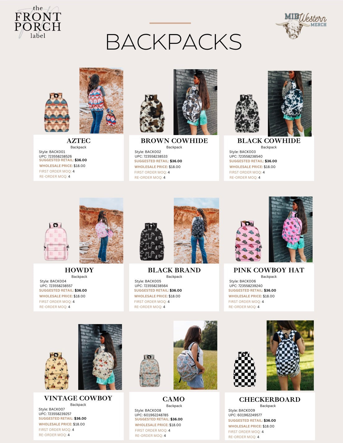 This Backpack Bundle includes 10 assorted of our top-selling patterns and counts toward the $2,500 minimum.
