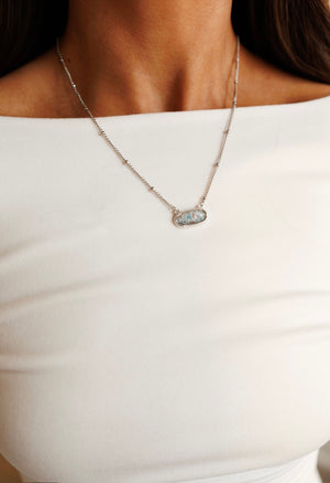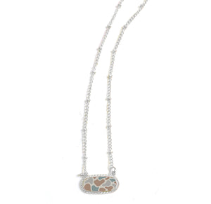 This 18-inch necklace features a delicate bead chain crafted from imitation gold-plated alloy with box copper components. The metal is lead- and nickel-free for comfortable everyday wear. At the center, a smooth resin focal piece adds a modern, polished touch, making this necklace an easy statement for layering or wearing on its own.